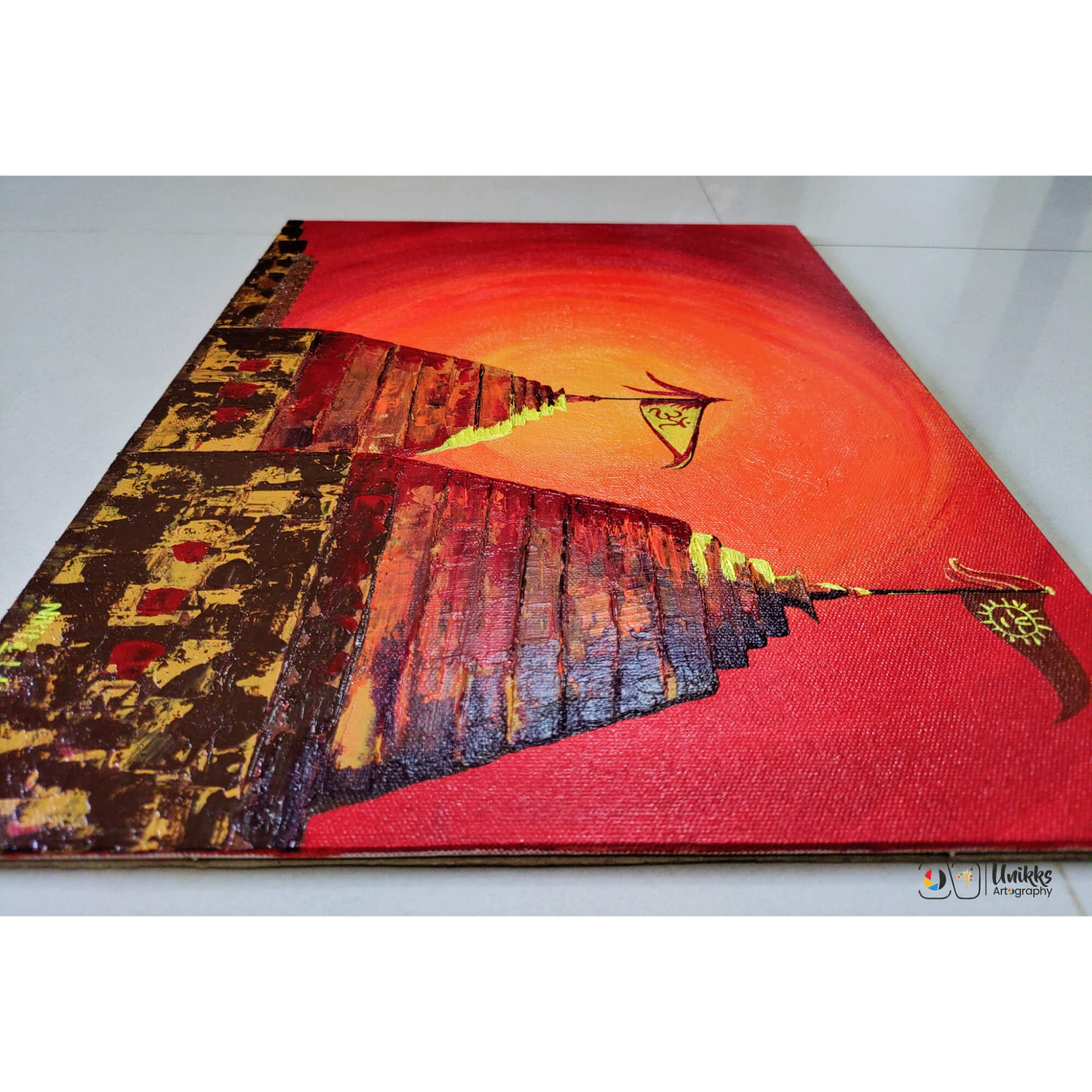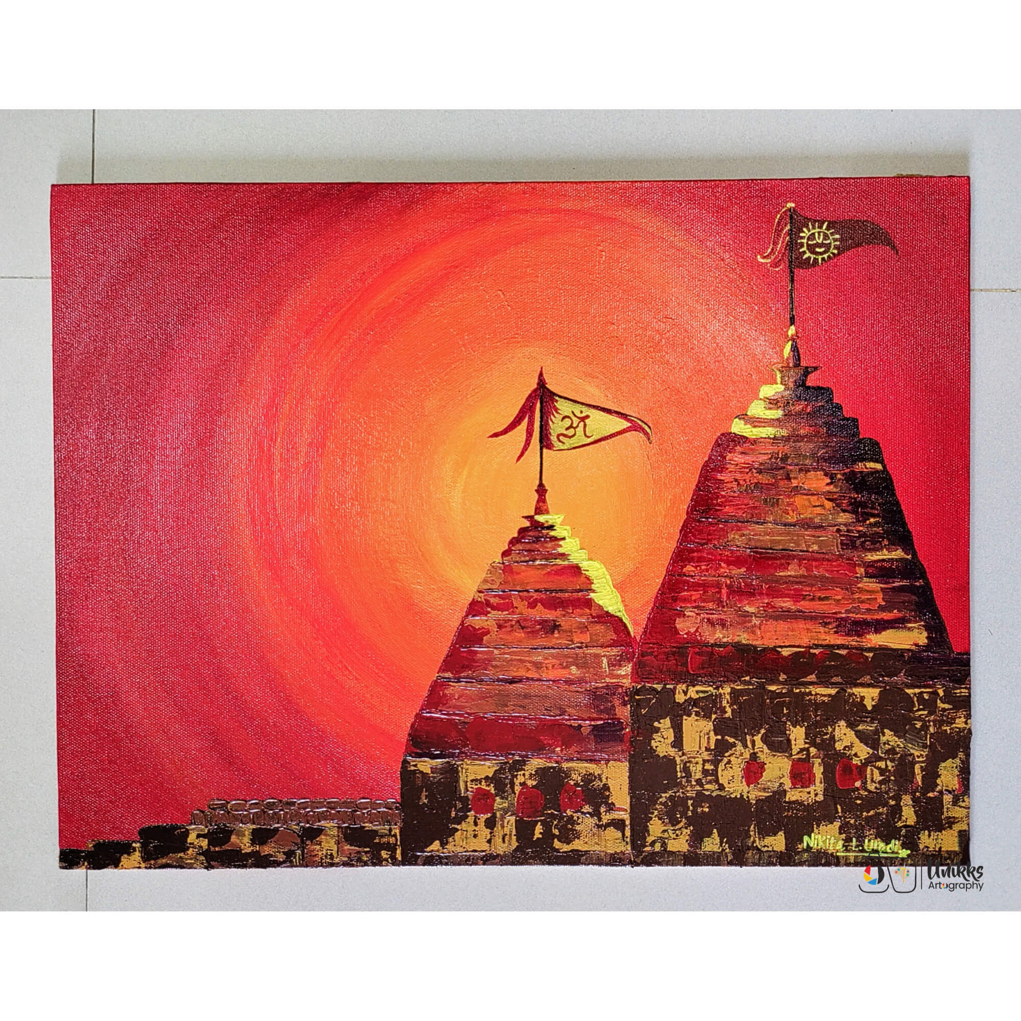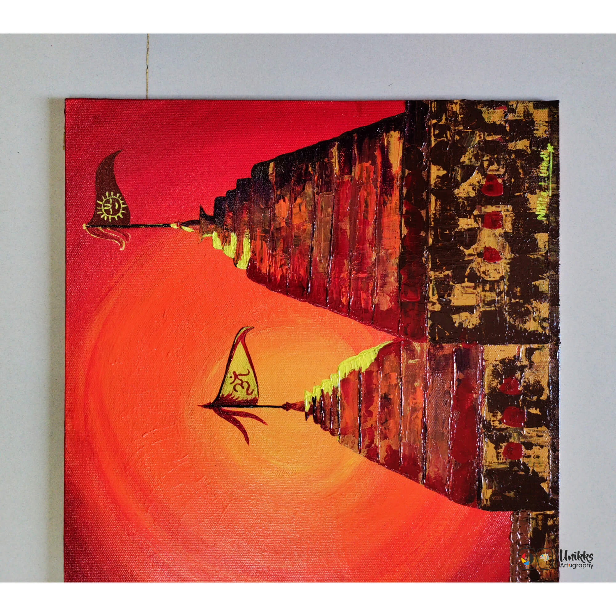 As an Indian artist I love to work upon themes like temples of India and other sacred elements like sun, moon, earth and scripts. Aditya means the sun in Sanskrit. It’s the colors and shades of the sun.